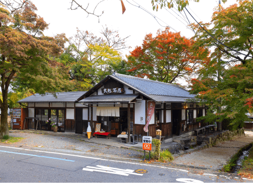 遮那王杉にちなんだ名物「遮那王餅」は、一本ずつの手作りです。丸久小山園の抹茶と合わせる、特製そばまんじゅうも大人気。